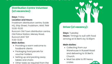 We need volunteers to work in any of our seven distribution centres across Runcorn and Frodsham; checking client vouchers and issuing food parcels to them as they come to collect.
